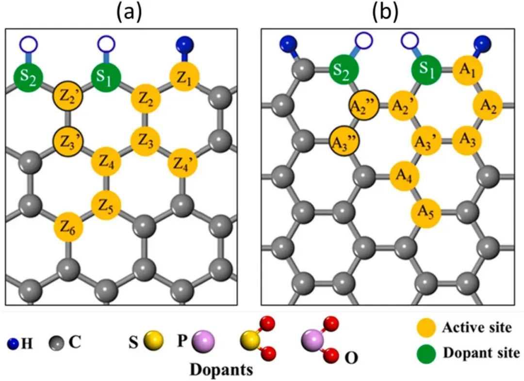 石墨烯纳米带(GNR)是适合掺杂更大尺寸杂原子(如硫和磷)在边缘上,从而诱导出大量活性碳位点的合适候选者。根据边缘,GNR主要分为两种类型:锯齿纳米带(2n-ZGNR)和椅子型纳米带(n-AGNR),表现出不同的特性,其中n表示纳米带的宽度。在ZGNR和AGNR的边缘处,碳原子使用氢原子被占据。首先,考虑了6-ZGNR和11-AGNR模型,通过13种不同的硫(S)、磷(P)、二氧化硫(SO2)和二氧化磷(PO2)的配置进行边缘掺杂(图1,S1)。掺杂配置如下:S、SO2、P、PO2、2S、2P、2SO2、SP、SSO2、SPO2、PSO2、PPO2、SO2PO2。对于GNR模型中的每种边缘掺杂配置,同时确定了一些碳位点作为可能的ORR活性位点(图1)。最终通过ZGNR和AGNR中各种边缘掺杂配置设计了共计136种不同的活性位点(26个系统)。