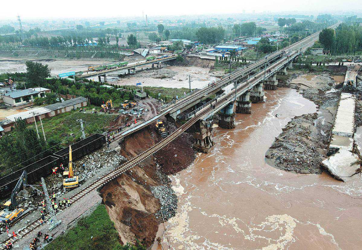 RescueteamsrepairasouthernsectionoftheDatong-YunchengRailway,thefoundationofwhichwaswashedawaybyfloodwaters,inQixiancounty,Shanxiprovince,onThursday.[PhotobyLiZhaomin/forChinaDaily]