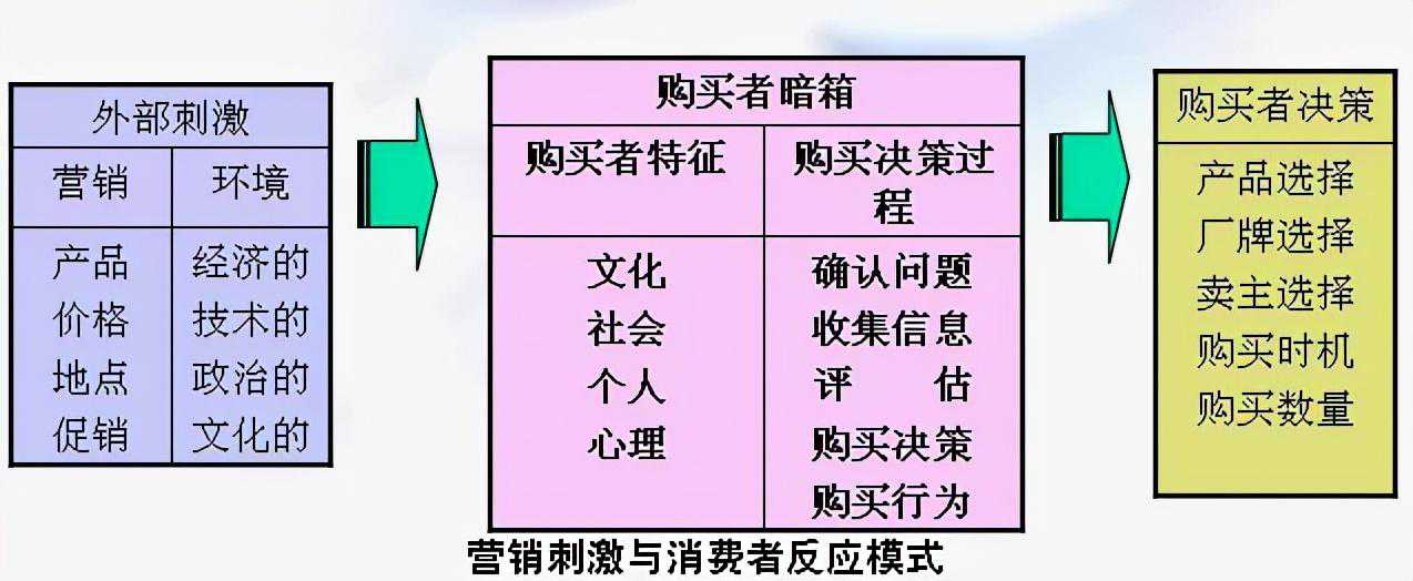 消费者行为黑盒模型黑盒模型也被称为刺激-反应模型,该模型认为消费者接触到来自商家的营销组合和其他外部环境刺激,并在他们的脑海中进行处理(黑匣子),他们将外部刺激与他们预先储存的知识(如个人信仰和愿望)联系起来并最终做出购买决策。