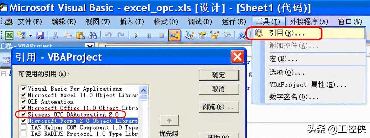 在Excel中创建一个接口,在VisualBasic编辑器中的“工具-引用”中,选中“”组件,使VisualBasic能够识别OPC对象。