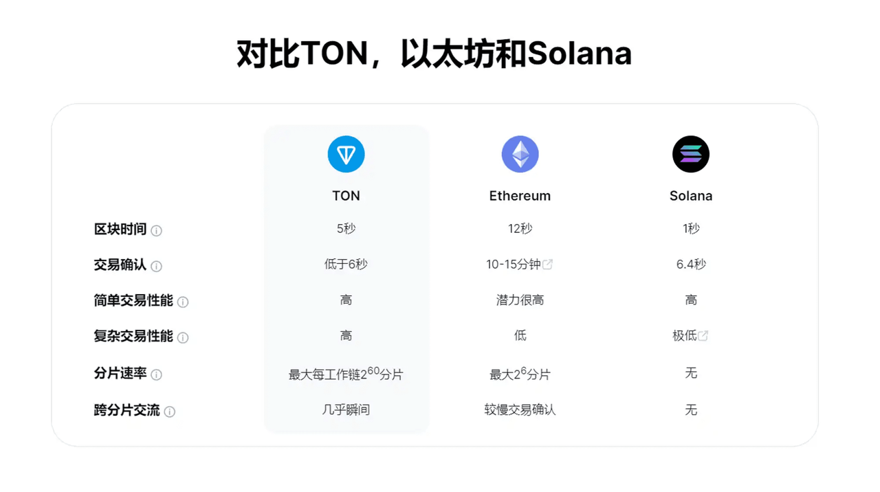 以下是TON与Ethereum、Bitcoin网络的对比: