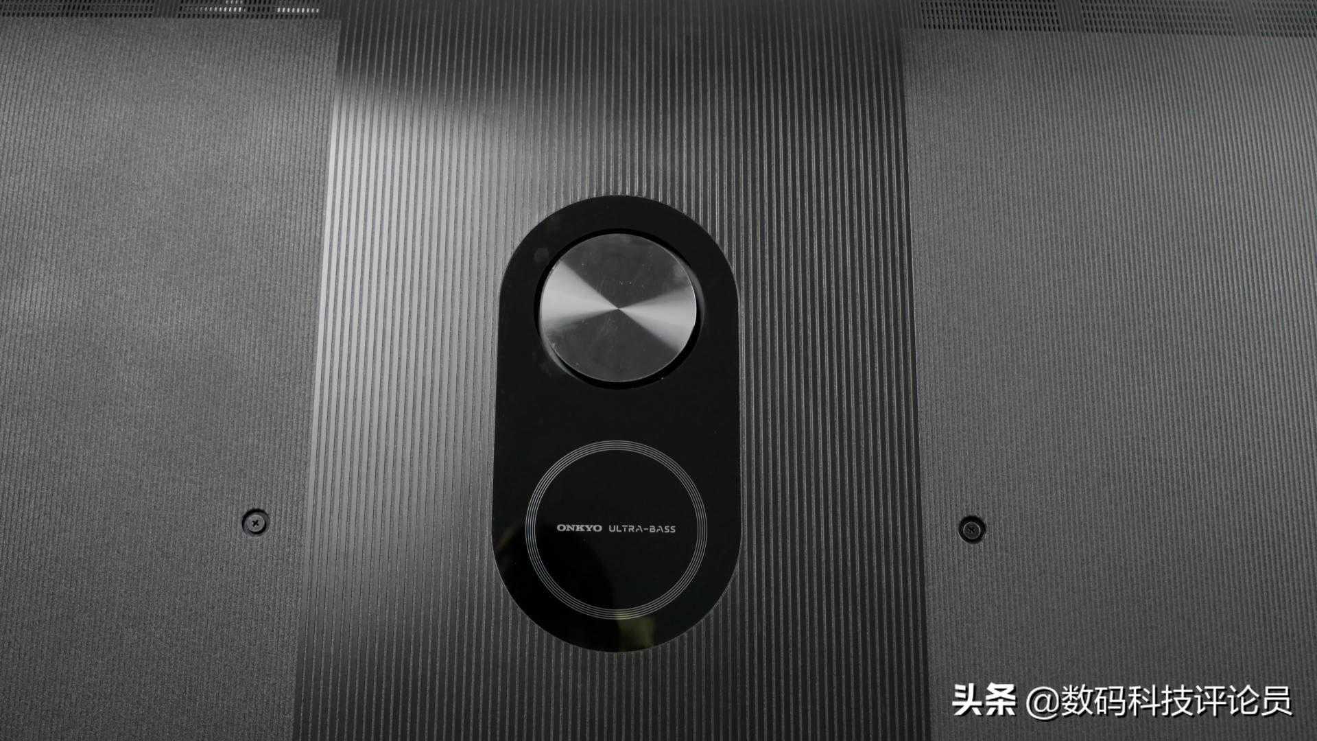 背板看过去也是整洁干净,平整的背面没有多余的点缀。而在电视背部靠上位置的的两侧,各配置了一枚扬声器,背部支架上还配有一枚独立低音大音腔,这样的设计自带立体声。