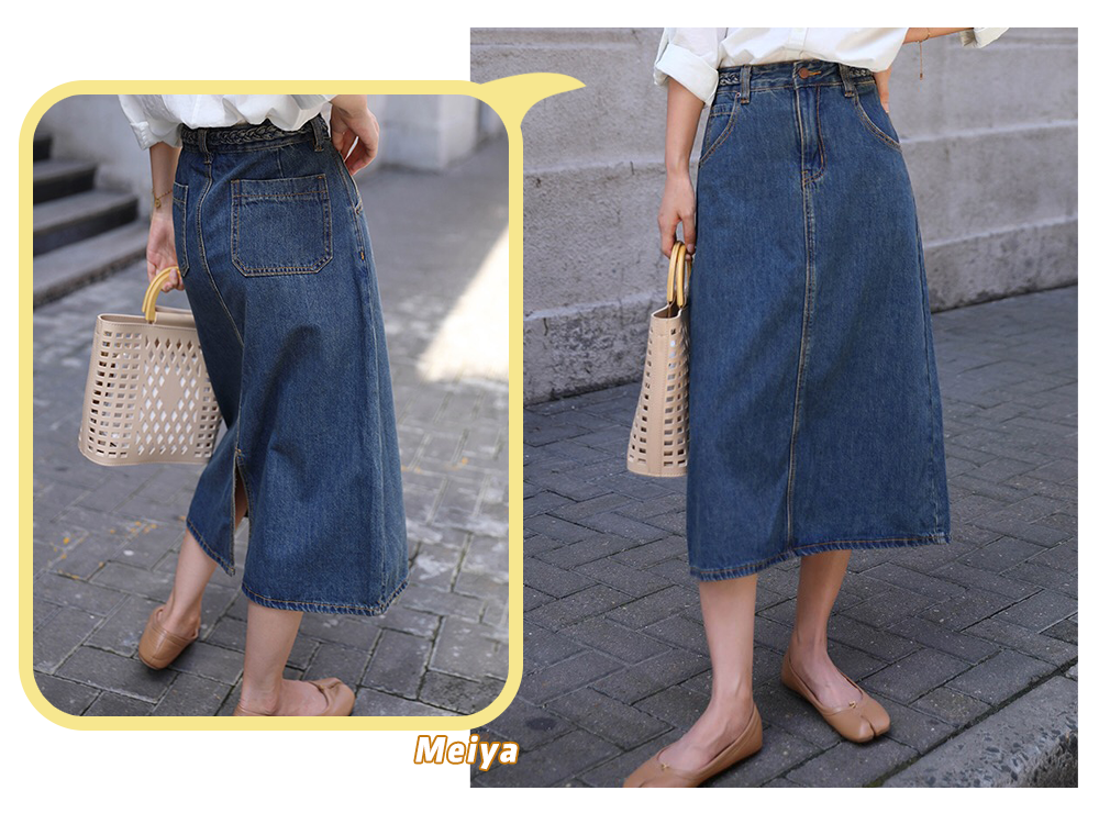 麻花辫后开叉复古深蓝色牛仔半身裙