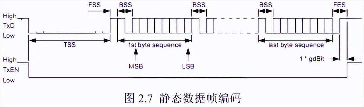 FSS(帧启动序列):用来补偿TSS后第一个字节可能出现的量化误差,为一位的高电平BSS(字节启动序列):给接受节点提供数据定时信息,由一位高电平和一位低电平组成。