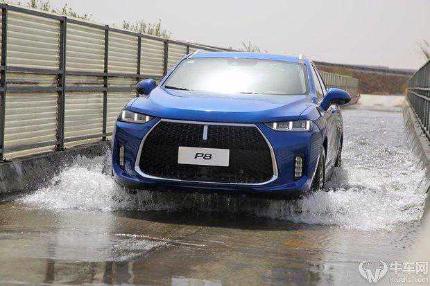图:对于一个SUV来说,这种简单的涉水并没有什么难度,由于P8的电池设计并不在底盘下面而是在后部,所以车辆整体保证了行进高度。WEYP8最大涉水深度为500mm,重要的是高压系统零部件满足IP67的防水等级,确保高压系统涉水安全。180mm的离地间隙只要稳住油门按慢走水的节奏推进,此项测试便没有任何难度。