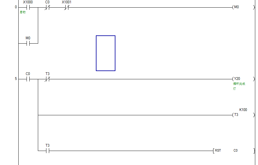 4、全部灭掉1秒后,重复第2步,循环3次后停止,并点亮主机板上输出模块的Y0,亮10秒后灭掉。