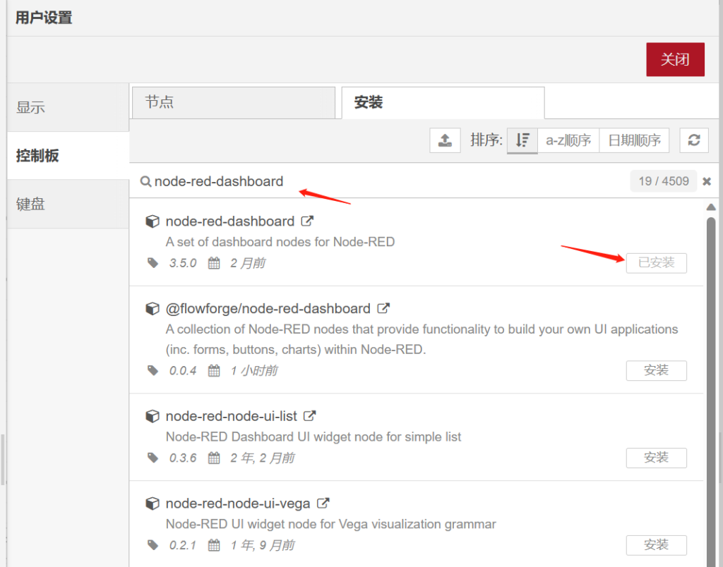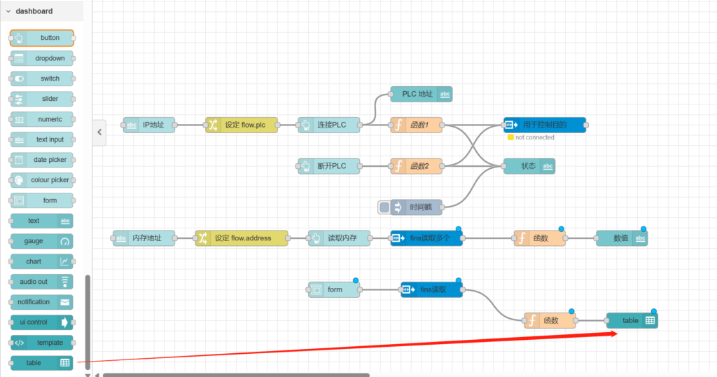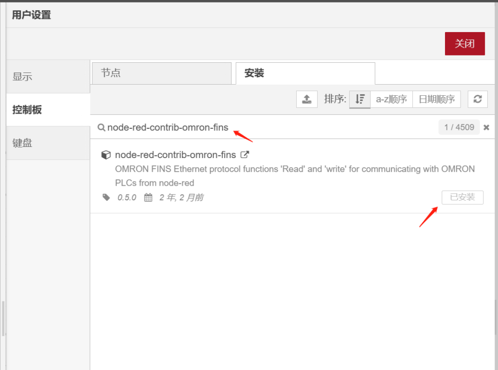 打开node-red后,需先添加几个节点,节点为(node-red-dashboard,node-red-node-ui-table,node-red-contrib-omron-fins),如下图示。