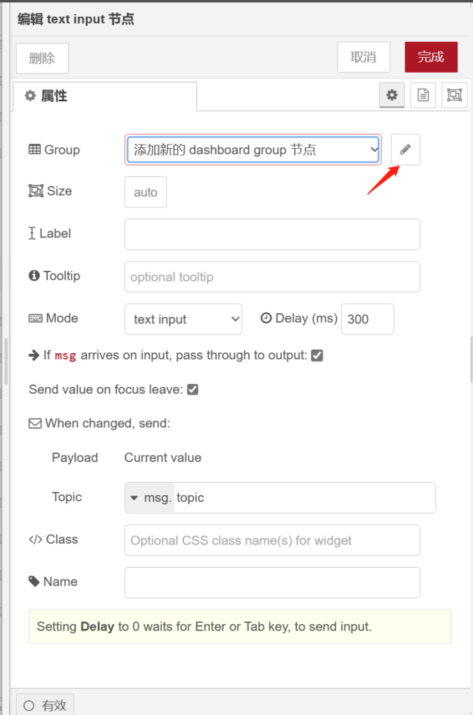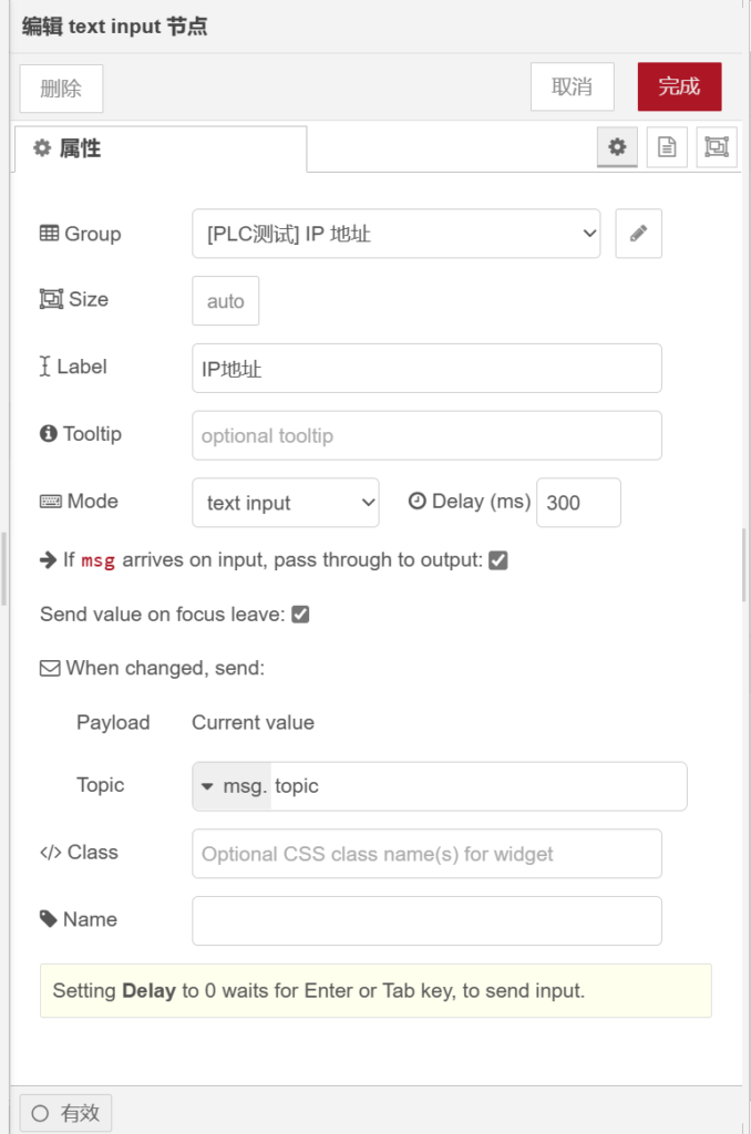 打开【button】节点,在【group】栏选择【[PLC测试]IP地址】群组,【label】栏输入【断开PLC】,【topic】栏属性值为【】,如下图所示。