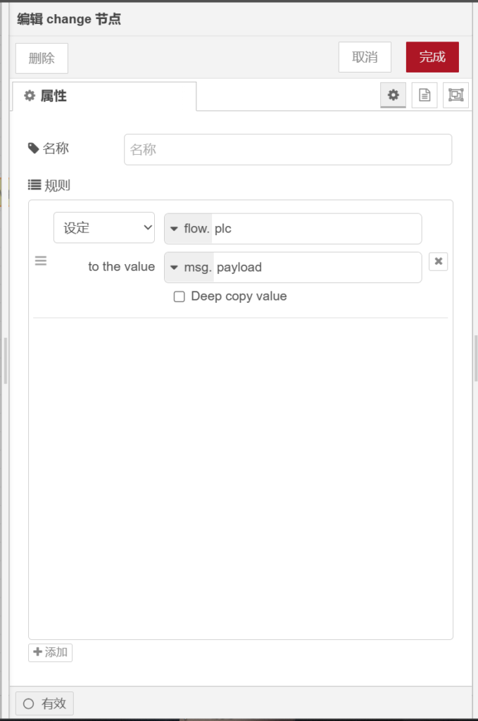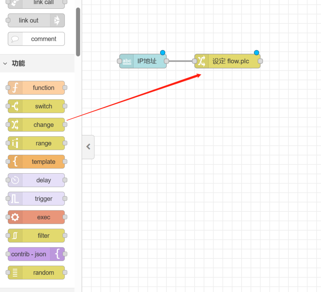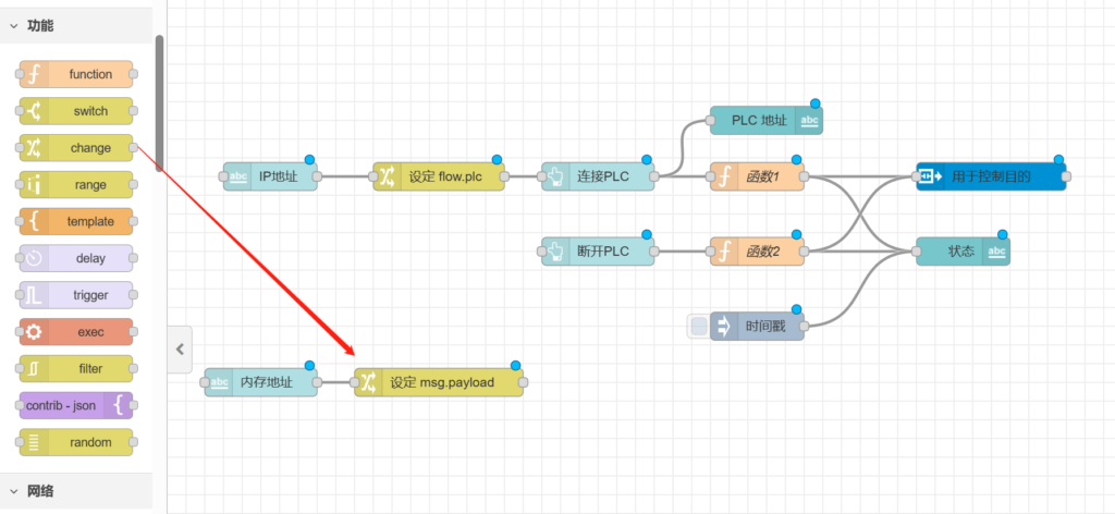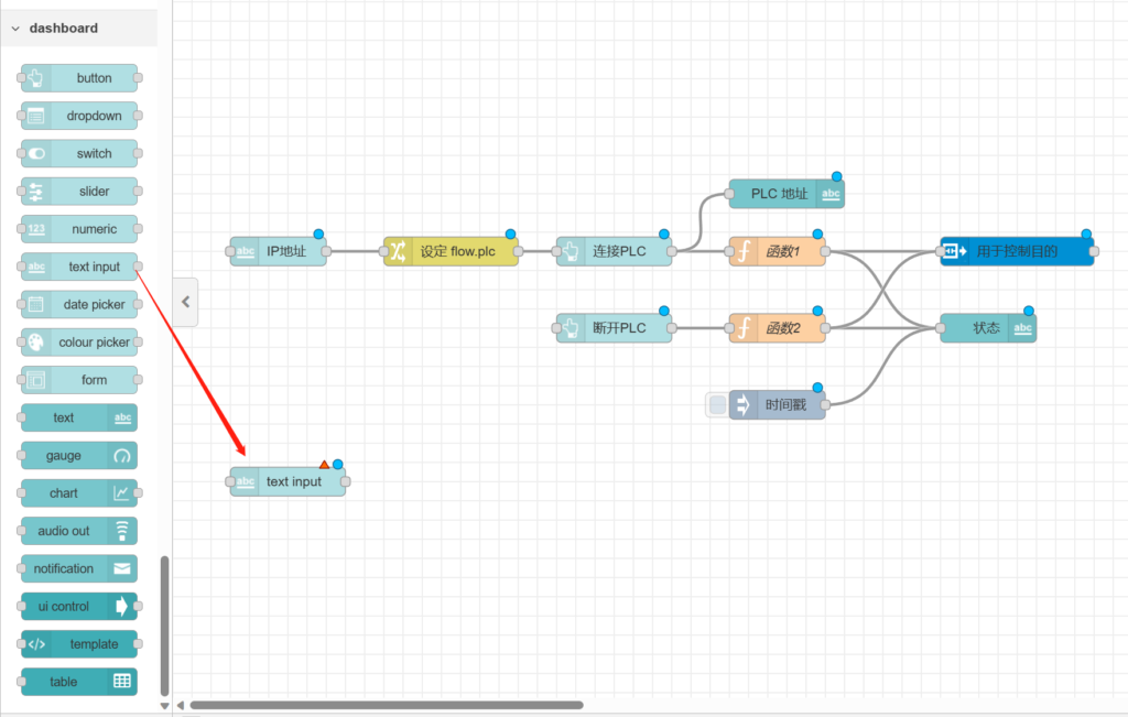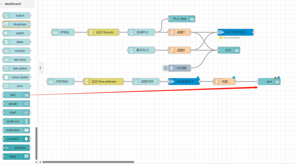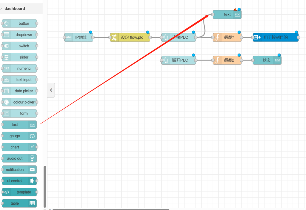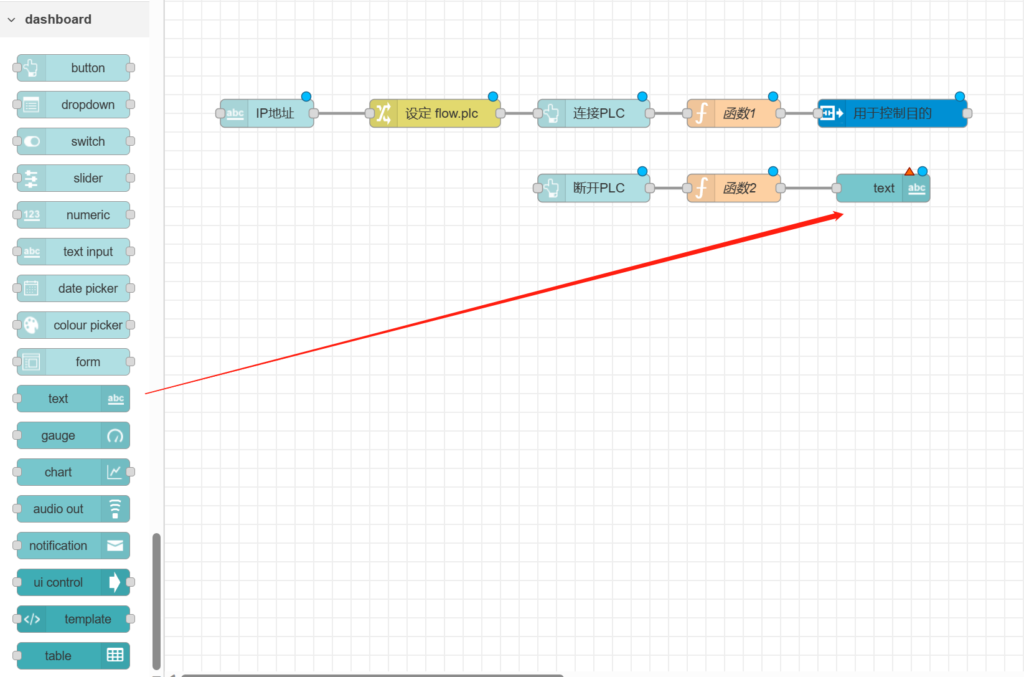再次拉出【text】节点置于【连接PLC】节点后方。