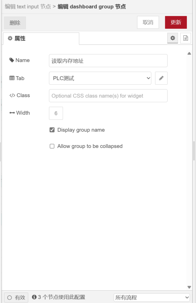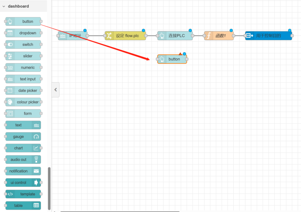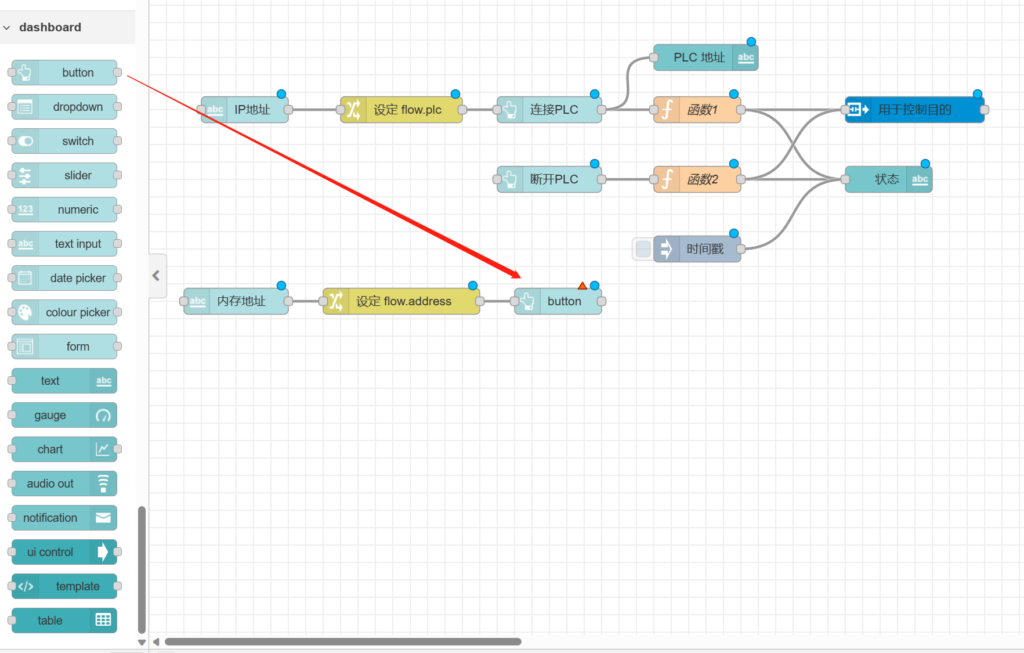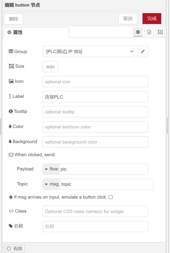 打开【button】节点,在【group】栏选中之前配置的【[plc测试]IP地址】,在【label】栏输入【连接PLC】,【payload】属性值为【】,【topic】属性值为【】,如下图所示。