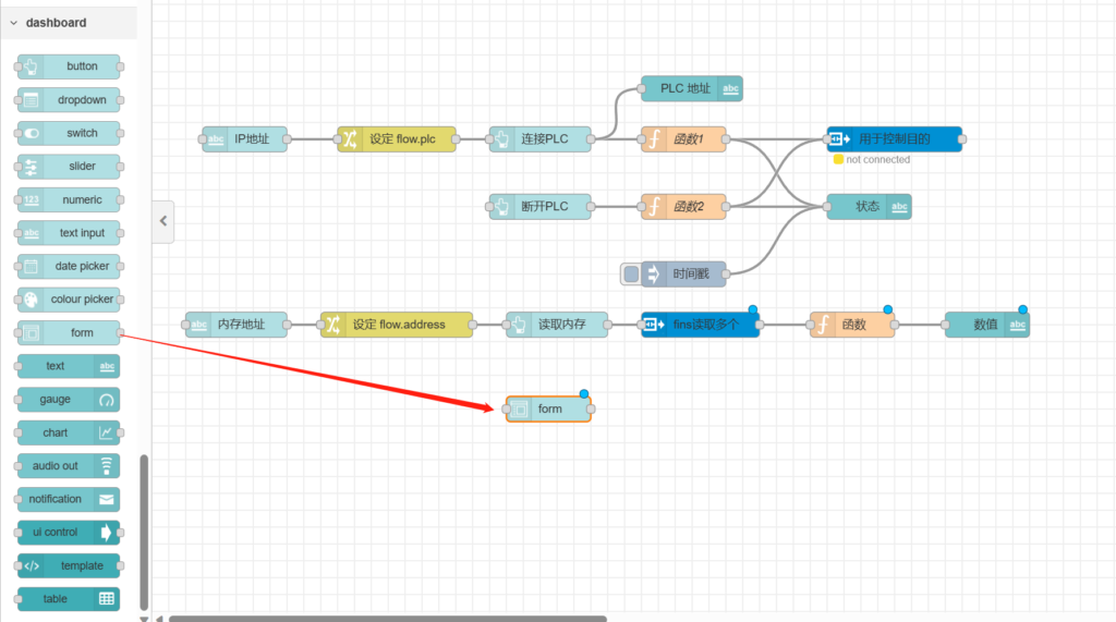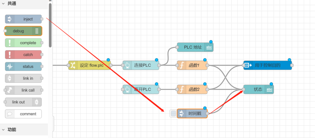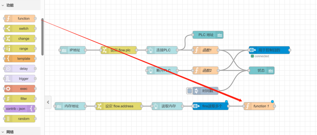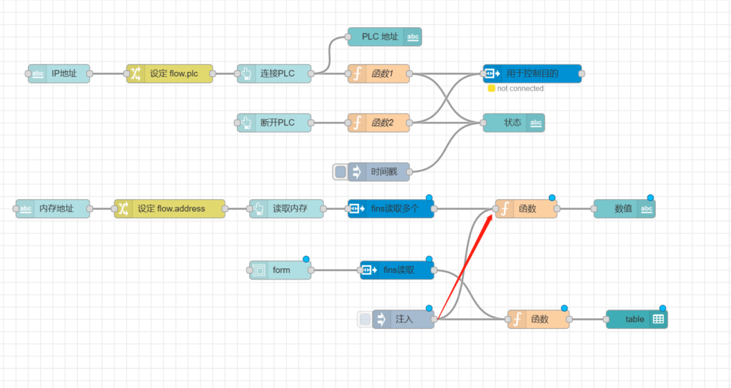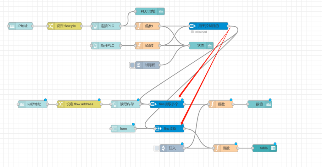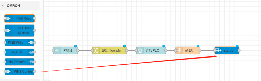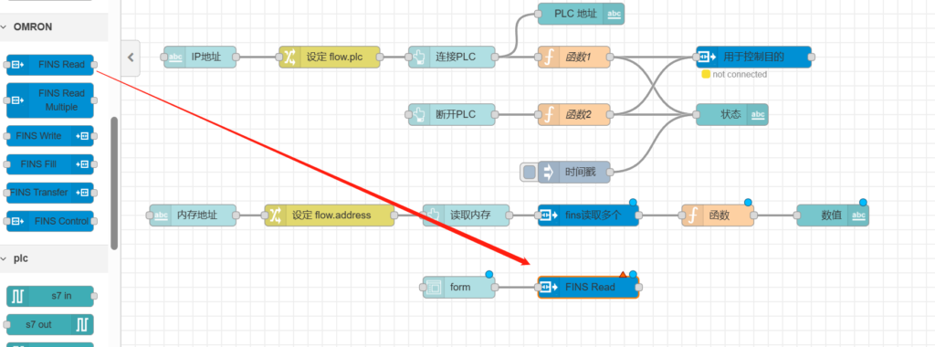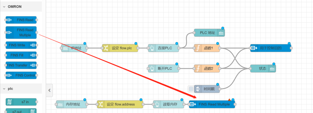 把【用于控制目的】节点跟【fins读取多个】和【fins读取】相连,如下图所示。