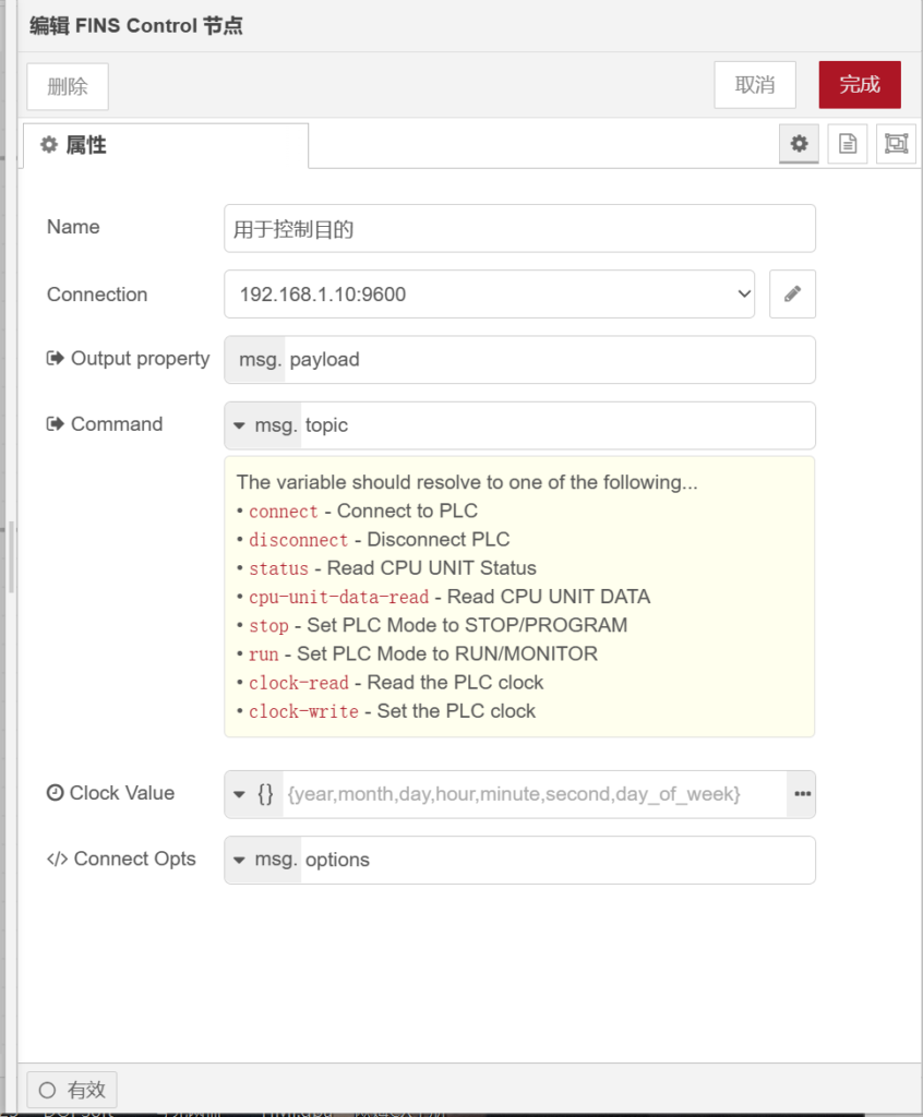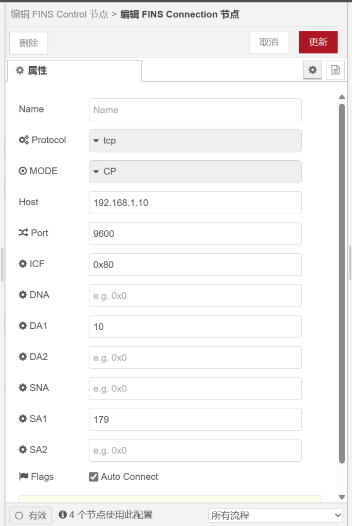 进入【finsconnection】节点,在【protocol】栏选择【tcp】网络通讯,【mode】栏选择【cp】型号,【host】栏输入PLCIP地址,【port】栏输入端口号,【ICF】栏输入【0x80】,【DA1】栏输入IP地址最后几位数,【SA1】栏输入【179】,如下图所示。