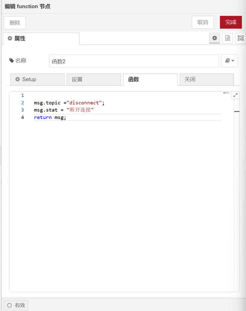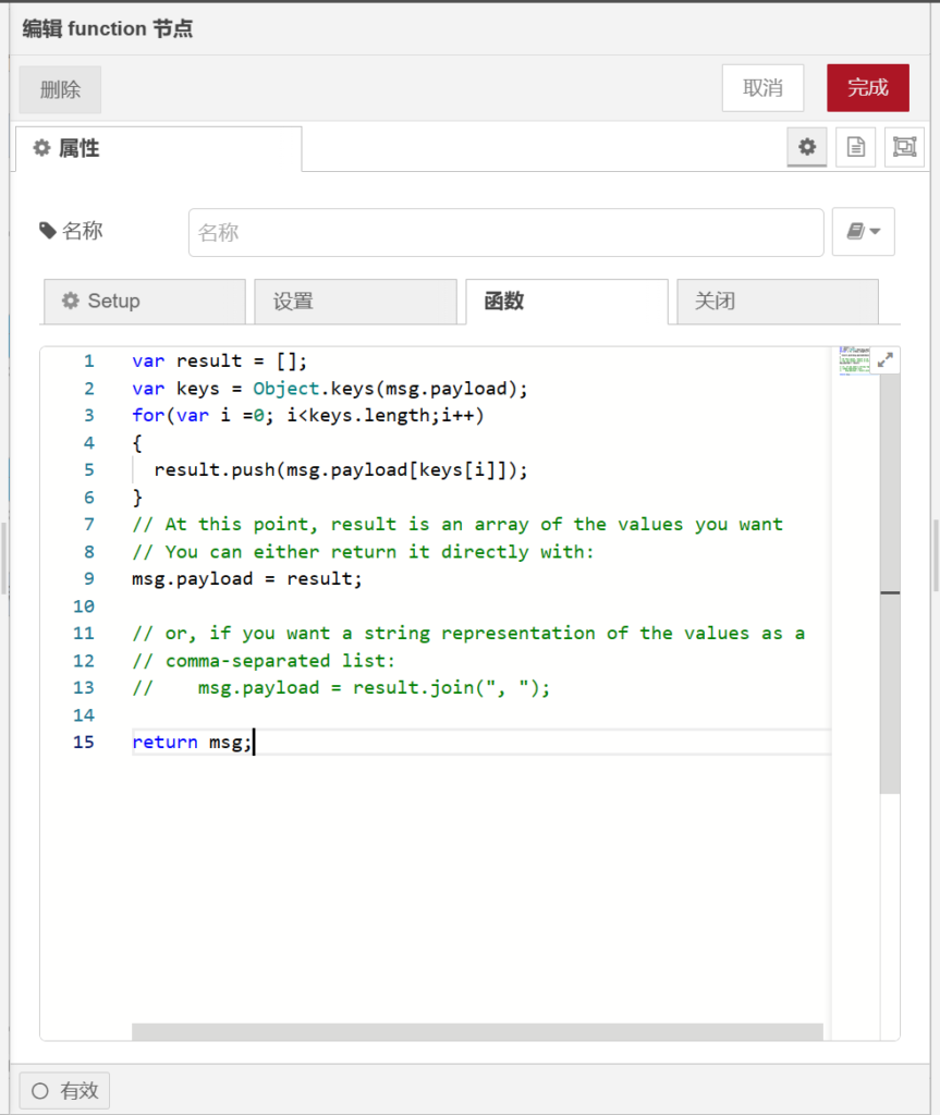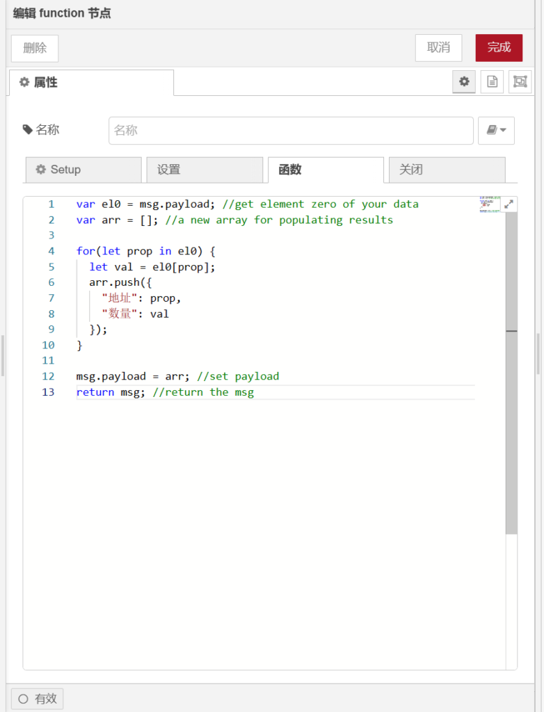 【function】节点能够在【功能】节点工具箱中找到,打开【function】节点,在【名称】栏输入【函数1】,代码如下图所示。