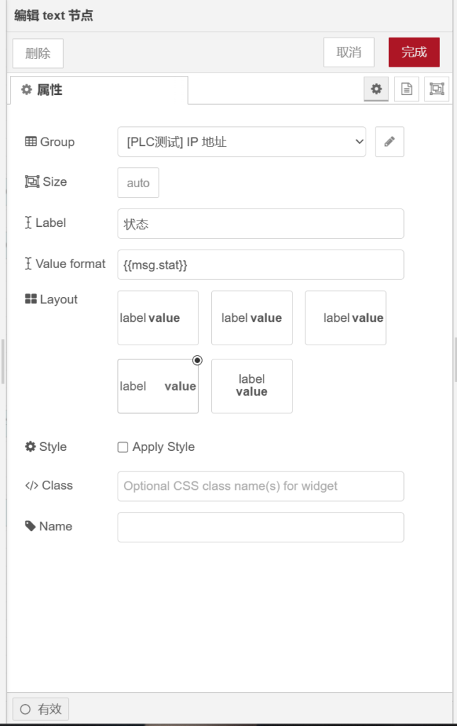 打开【text】节点,在【group】栏选择【[PLC测试]IP地址】,【label】栏输入【状态】,【valueformat】栏属性值为【{{}}】,如下图所示。