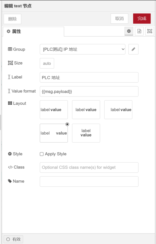 打开【text】节点,在【group】栏选择【[PLC测试]IP地址】,【label】栏输入【PLC地址】,【valueformat】栏属性值为【】,如下图所示。