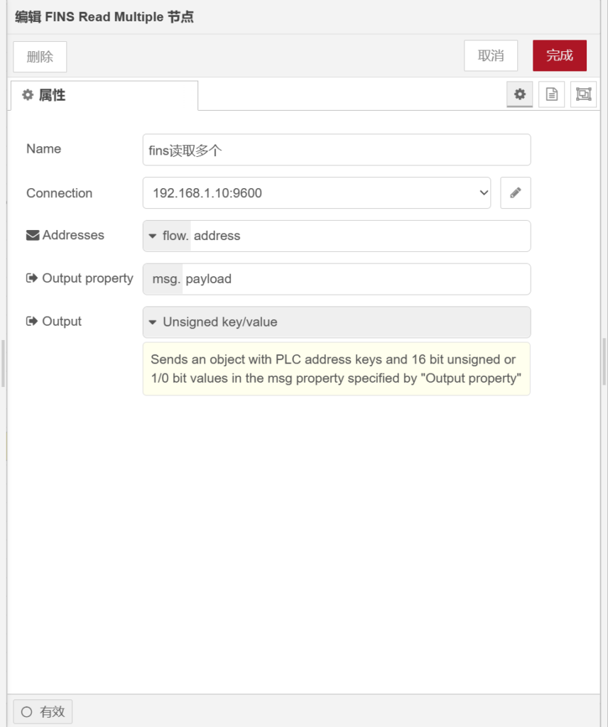打开【finsreadmultiple】节点,在【name】栏输入【fins读取多个】,在【connection】选择建好的IP地址,在【addresses】栏属性值【】,在【outputproperty】属性值为【】,【output】栏选择【unsigndkey/value】,如下图所示。