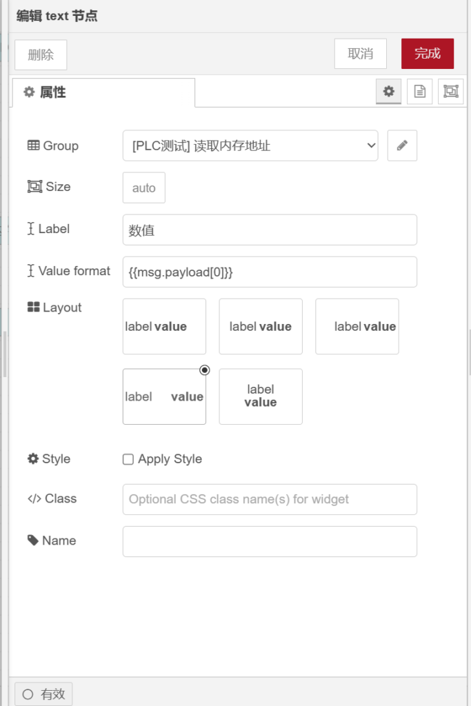 打开【text】节点,在【group】栏选择【[PLC测试]读取内存地址】,在【label】栏输入【数值】,【valueformat】栏属性值为【{{[0]}}】,如下图所示。