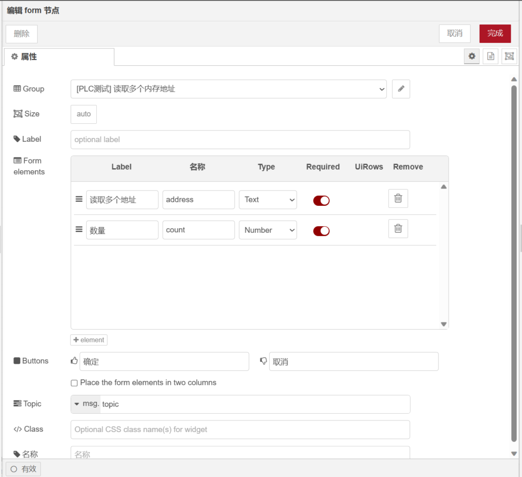 打开【button】,在【group】栏选择【[PLC测试]读取内存地址】群组,【label】栏输入【读取内存】,【payload】栏输入【】,【topic】栏输入【】,如下图所示。