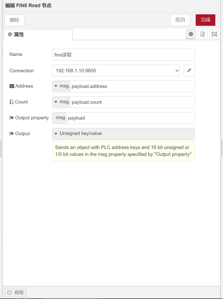 打开【finsread】节点。在【name】栏输入【fins读取】,在【connection】栏选择IP地址,【address】栏属性值为【】,【count】栏属性值为【】,【outputproperty】栏属性值为【】,【output】栏选择【unsignedkey/value】,如下图所示。