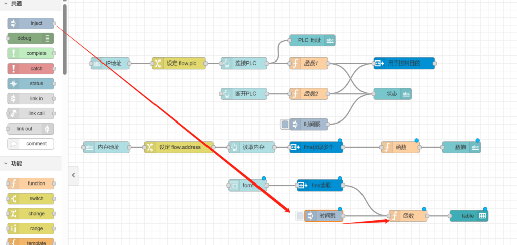 把【inject】节点跟【fins读取多个】节点后的【函数节点】相连,如下图所示。