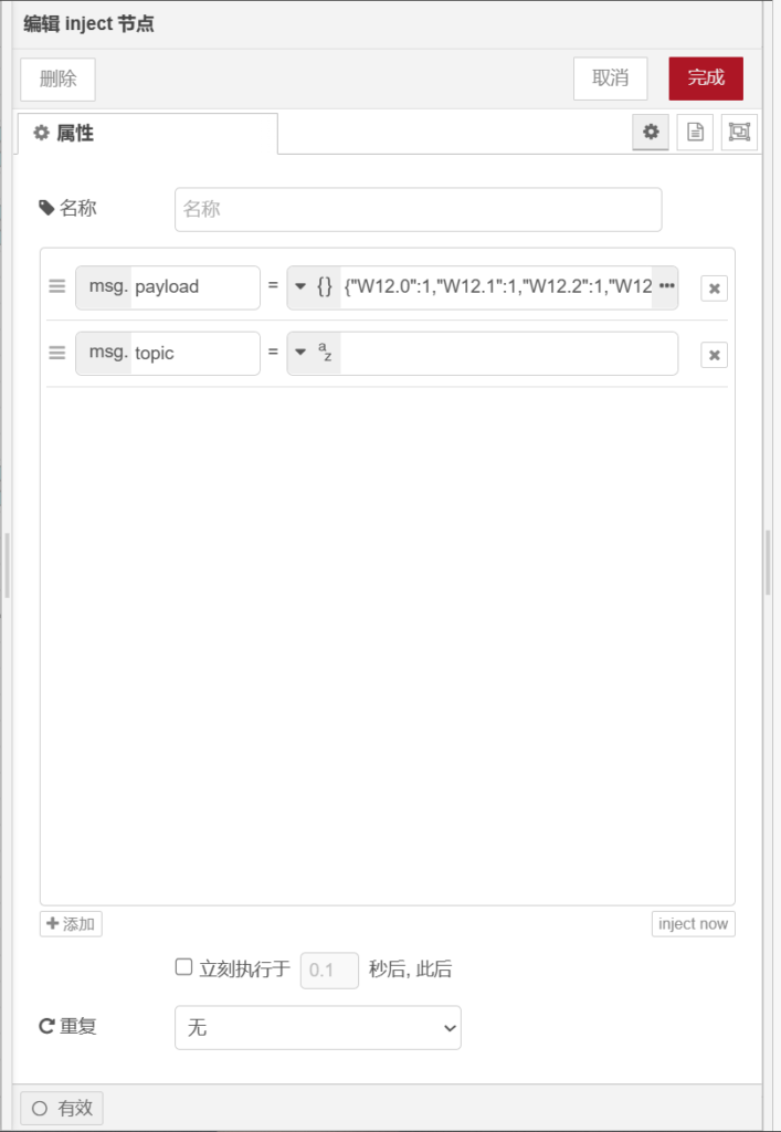 打开【inject】节点,属性值为【】={}json,如下图所示。