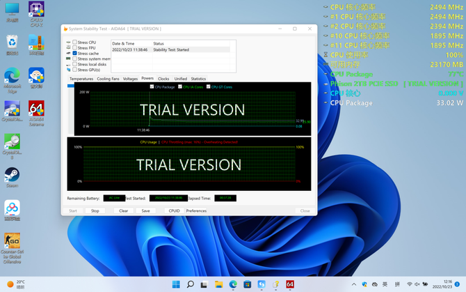 针对散热与性能释放的稳定性,我们通过使用AIDA64内置的StressFPU功能进行CPU单烤测试,观察CPU温度、功耗等数据。从实际的测试来看,半个小时后,H3CBookUltra14T功耗为33W,CPU内部温度为77°C,核心频率为2.5GHz,可见性能和散热还是非常出色的。