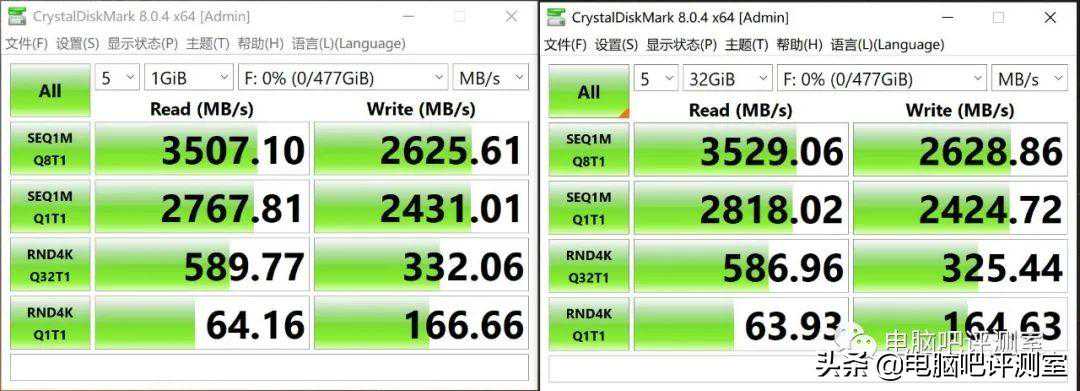 CDM方面,在1G和32G两个数量级的测试中,顺序读取均超过了3500M/S,顺序写入也均超过2600M/S,而官方对于512G容量的宣传是顺序读取最大3400M/S,顺序写入最大2400M/S,相比之下官方宣传数据偏保守一些;