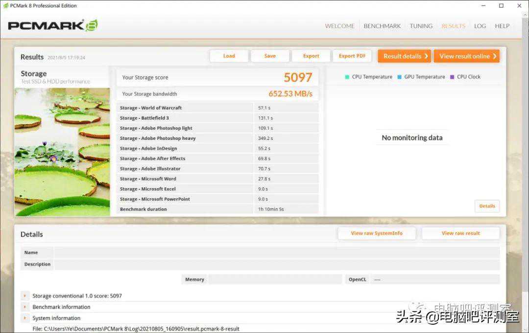 在PCMARK8的硬盘测试中拿下5097分,测试带宽也达到了652.53MB/S,成绩不错,足够胜任日常使用中的绝大部分情况。
