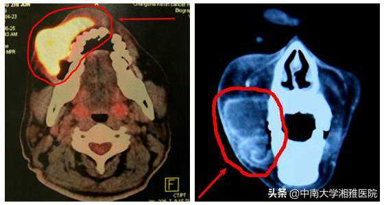 进一步的检查显示,肿瘤已经侵犯长满了张先生的右半脸,向上侵犯到了上颌骨,向下到了颈部,甚至越过脸部中线,侵犯了对侧上唇。