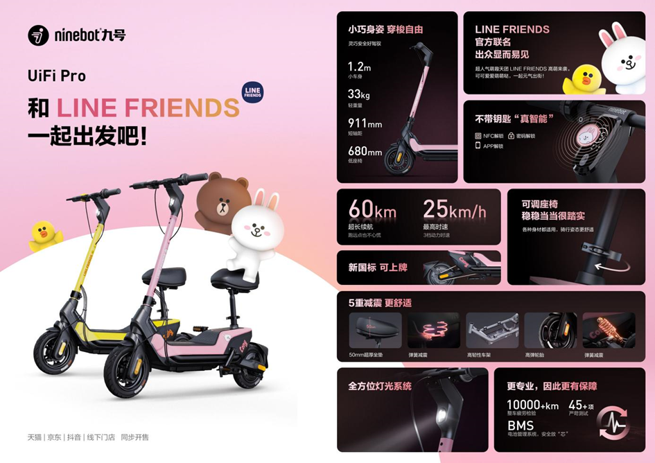 新品发布会领潮新物种来袭,九号电动滑板车UiFi系列产品典型续航达45公里,九号电动滑板车UiFiProLINEFRIENDS联名款典型续航达60公里,可上电动自行车牌照,跑远一点也不心慌。除此之外,UiFi标准版还拥有“50毫米超厚坐垫、弹簧减震、高韧性车架、10英寸高弹轮胎”四重减震,UiFiPro国标版还在UiFi标准版基础上增加配备运动性能后弹簧,可有效缓解冲击。全系产品支持一键定速巡航功能,解放双手,久骑不累。值得一提的是,UiFiPro可妮兔、UiFiPro萨莉鸡两款产品,精准狙击用户审美,让小巧的产品更可爱。萌点满满,颜粉必须拥有。
