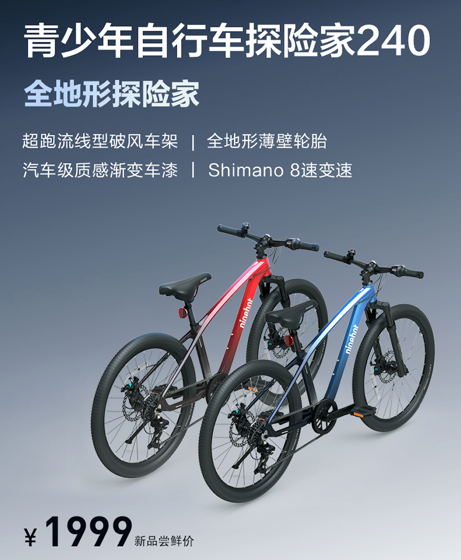九号青少年自行车探险家240,采用众多高端技术设计,为8岁以上身高130-160cm的青少年儿童,带来更高标准的全新骑行体验。该车反复优化人机比,使得车架几何参数更符合青少年的人体工学。超跑流线型破风车架,将山地车架型和公路车造型完美结合,既坚固安全,又能破风降阻,提升效率;运用创新渐变色技术,历经4喷4烤八道工艺,打造出汽车级质感的幻彩车漆,一眼惊艳;各种细节的配置同样出众,全地形薄壁胎和创新隐藏式鞍座伸缩机构,使得该车能适应多种地形,且不易爆胎,即使是崎岖路况,也能稳稳当当,完全不负“全地形探险家”的称号。