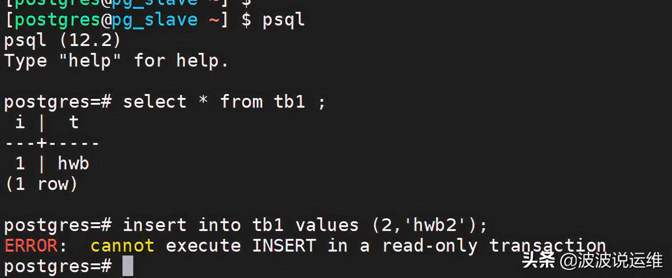 select*fromtb1;brinsertintotb1values(2,'hwb2');PostgreSQL主从数据库切换