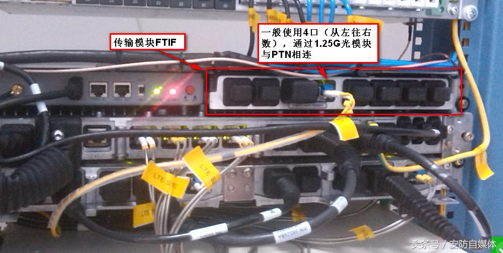 传输扩展单元FTIF,也称传输板。因为基站不是孤立存在的,需要进行组网,基站利用这个模块的第四个光口(从左往右数),通过光纤与传输设备相连,实现传输。这地方说的传输设备,主要的作用是使众多基站组网的设备,后台网管可以通过这个设备提取基站数据,或对基站进行相关操作,每个机房都会有,一般使用华为或中兴生产的传输设备。