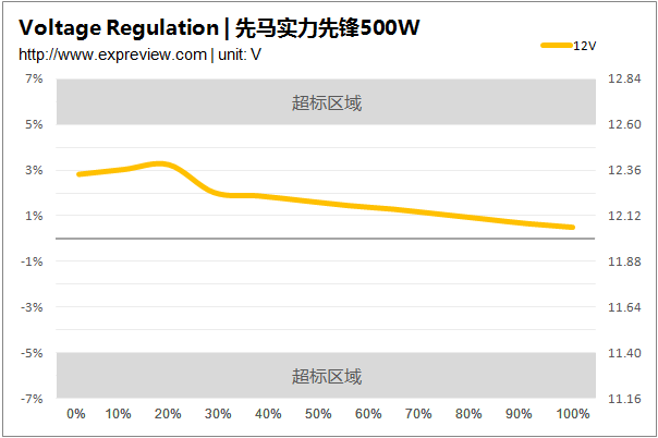 由于单磁放大结构在交叉负载(拉偏测试)在天生就存在劣势,因此先马实力先锋500W在这部分的表现并不算理想,不过尽管如此其各路输出的电压偏离情况依然没有超出Intel设计规范的推荐值,表现还是对得起价格的。