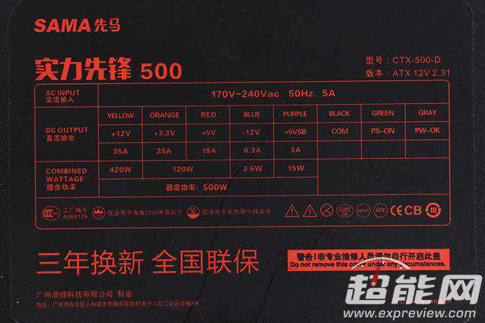 先马实力先锋500W的保持时间是在75%负载(DC输出375W)的情况下测得。