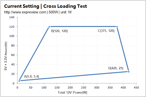 测试点的X坐标表示总的+12V的输出功率,Y坐标表示+5V和+3.3V的输出功率之和。