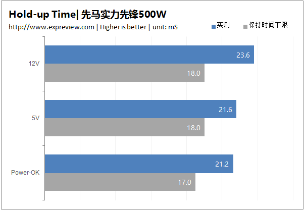 对于12V和5V,合格的标准是保持时间等于或者大于18ms,Power-OK(或者称PG,Power-Good)时间应该等于或者大于17ms。先马实力先锋500W的+12V保持时间为23.6ms,+5V和Power-OK则为21.6ms和21.2ms,所有测试均达标。