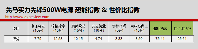 按照我们的评分标准,先马实力先锋500W电源的超能指数为75.41分,性价比指数则为95.61分。虽然性能方面不算很强,但是从其各方面的表现来说还是有可圈可点之处的。在转换效率上,先马实力先锋500W电源虽然没有进行80Plus认证,但是从转换效率的数据上来说已经接近80Plus铜牌的水平,同时其纹波表现也相当不错,12V输出纹波处于中上水平,5V与3.3V输出纹波均在规范要求之内,保持时间也全部达标。