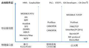 通讯协议:包括:PPI、MPI、MODBUS等;目前软件EasybuilderPro中已经内置了约300种通讯协议,支持成千上万种PLC、变频器、伺服、仪表等控制器类型;