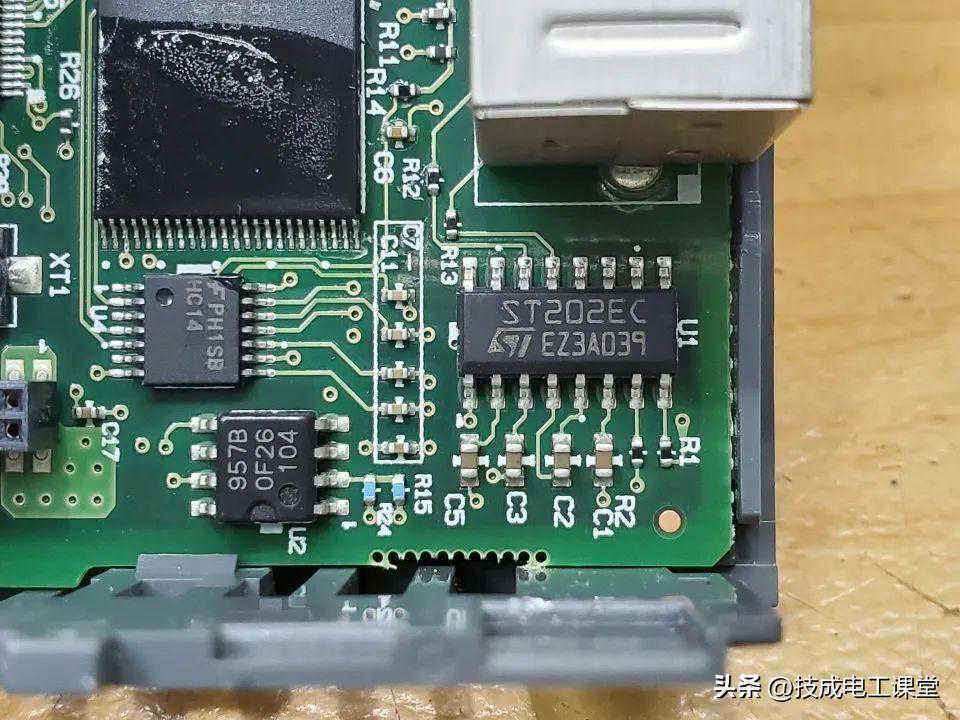 通过232接口进来的第一个芯片ST202EC,一颗来自意法半导体的RS232收发器,5伏供电,可以满足所有EIA/TIA-23E和规范,数据速率高达230kbps。