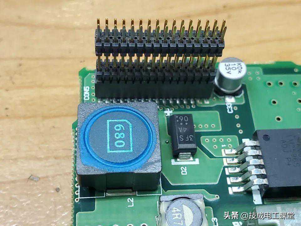 排线进来,先是一个功率电感,一个贴片二极管,旁边还有个35V电容。