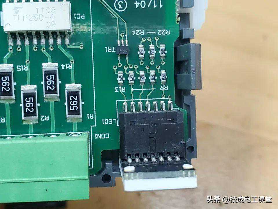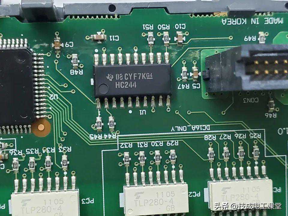 来控制下面4个白色的TLP280-4,是4个可编程控制器AC/DC输入模块PC卡调制调节器。后面通过几个贴片电阻链接对应的接口。