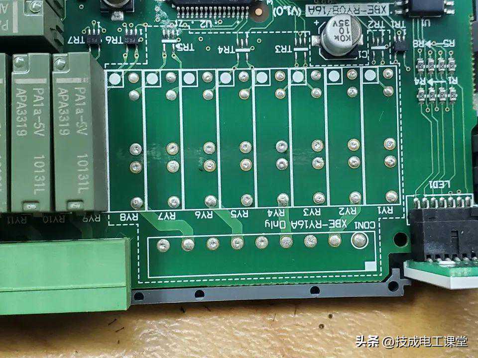 板的背部,可以看到8个继电器的引脚,都对应到一个开关管,再串联到LED,再链接到插头,跟PLC链接起来,给信号。