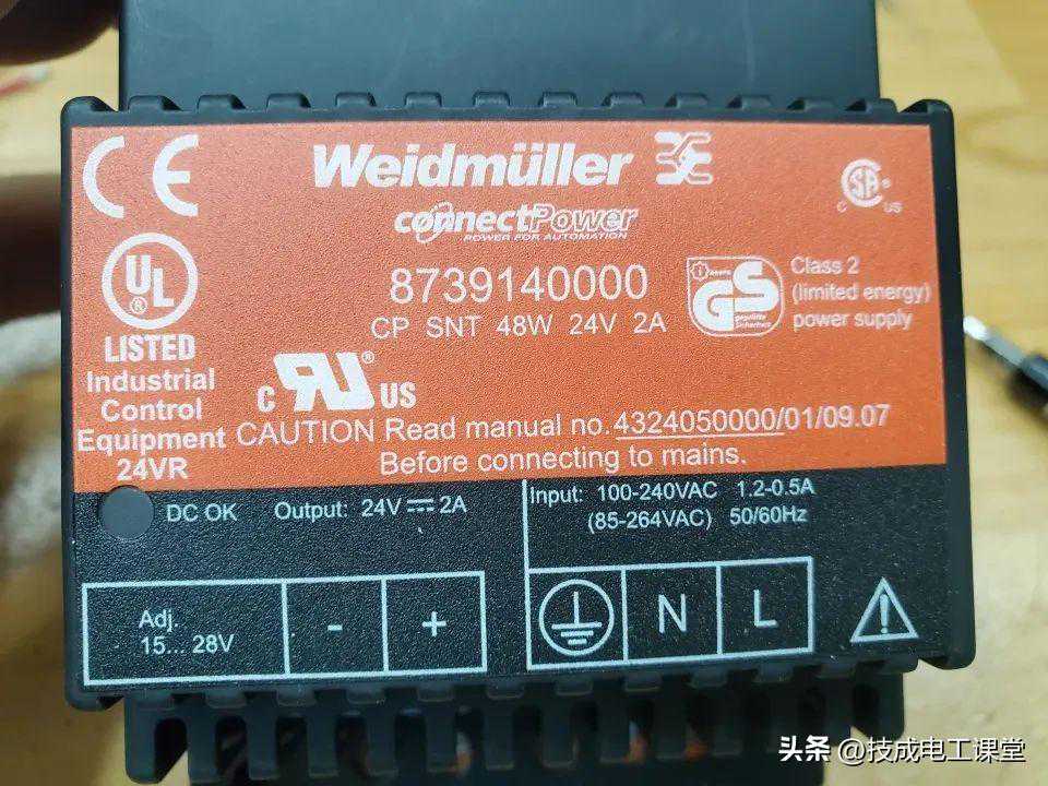 再来看看这个轨道电源,品牌魏德米勒,24V2A输出,最大功率48W,型号8739170000,pcb生产日期2007/11/27,一个16年的电源了。现在在某宝售价100-300左右,不过用料还可以,三信电容,变压器,安规电容,东芝K2607场效管,这堆用料这个价格,大家觉得怎么样?