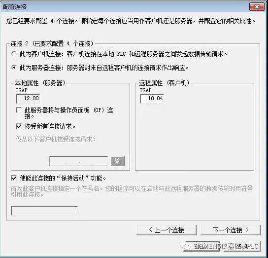 本例中第三个S7连接将(S7-200)组态为服务器连接,带CP343-1的S7-300站将作为客户端用于服务器连接。S7-200和S7-300的S7连接通过TSAP来定义。