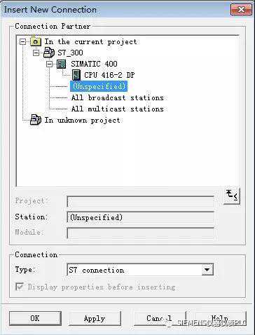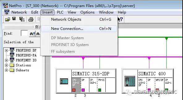 在NetPro中选中S7-300站的CPU并通过菜单命令,Insert--NewConnection添加一个新连接。