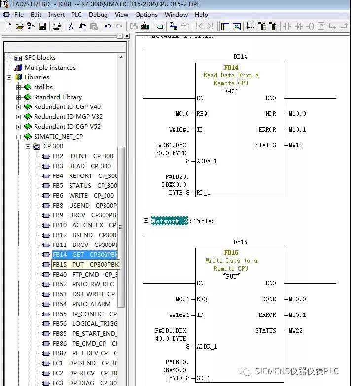 S7-300中调用功能块FB14“GET”和FB15“PUT”的例子程序