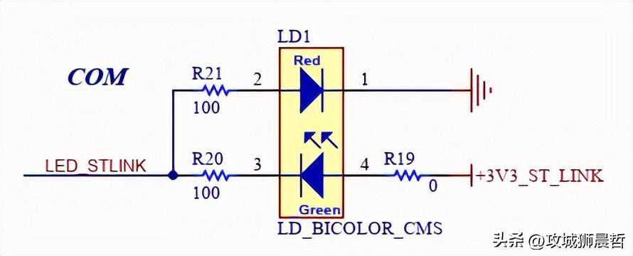 在ST官方的图纸中有一个名为COM的指示灯,这是一个红绿双色的LED指示灯,就是下图所示的这个LED。