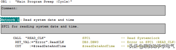 通过指针访问数据类型DATE_AND_TIME的单个变量。这种读取和设定系统时钟的步骤下面以样例说明,样例在OB1中用了4个网络段的程序。