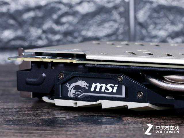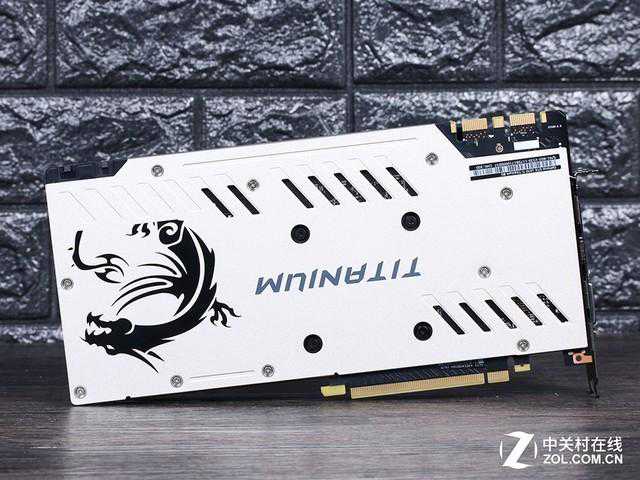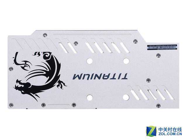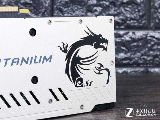 微星GTX1070TiTitanium钛金版的背面覆盖印有经典龙徽的银色金属背板,这片背板不但可以为PCB背面的元件提供保护,还可以提供一定的辅助散热能力,并起到加固作用。